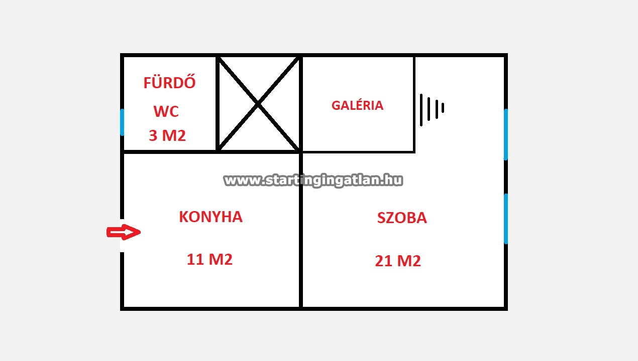 A szoba 21 m²-es, tágas, jól bútorozható. A 11 m²-es konyha beépített konyhaszekrénnyel ellátott, így azonnal használható. A fürdőszoba a mellékhelyiséggel egy légtérben található, ablakos kialakítású, természetes szellőzéssel, nemrégiben új zuhanykabin került beépítésre.