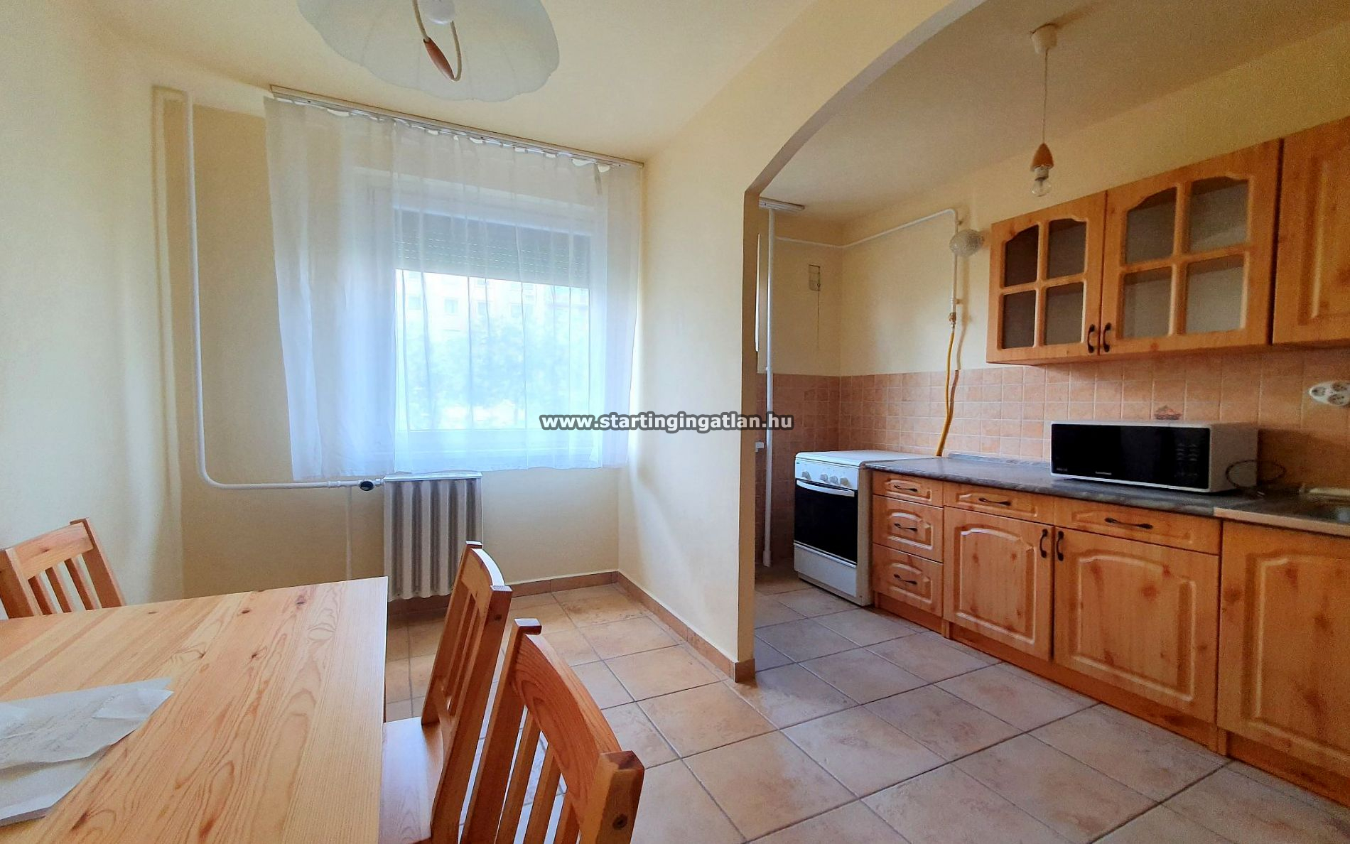 Ablakos konyhája beépített szekrényekkel, gáztűzhellyel, mikróval és hűtővel felszerelt, burkolata járólap. A fürdő zuhanyzós, a WC külön helyiségben kapott helyet, a mosógép is rendelkezésre áll. A fűtés távhő, átalányban 11.500 Ft/hó, a közös költség 17.300 Ft/hó. A víz és villany fogyasztás szerint fizetendő.